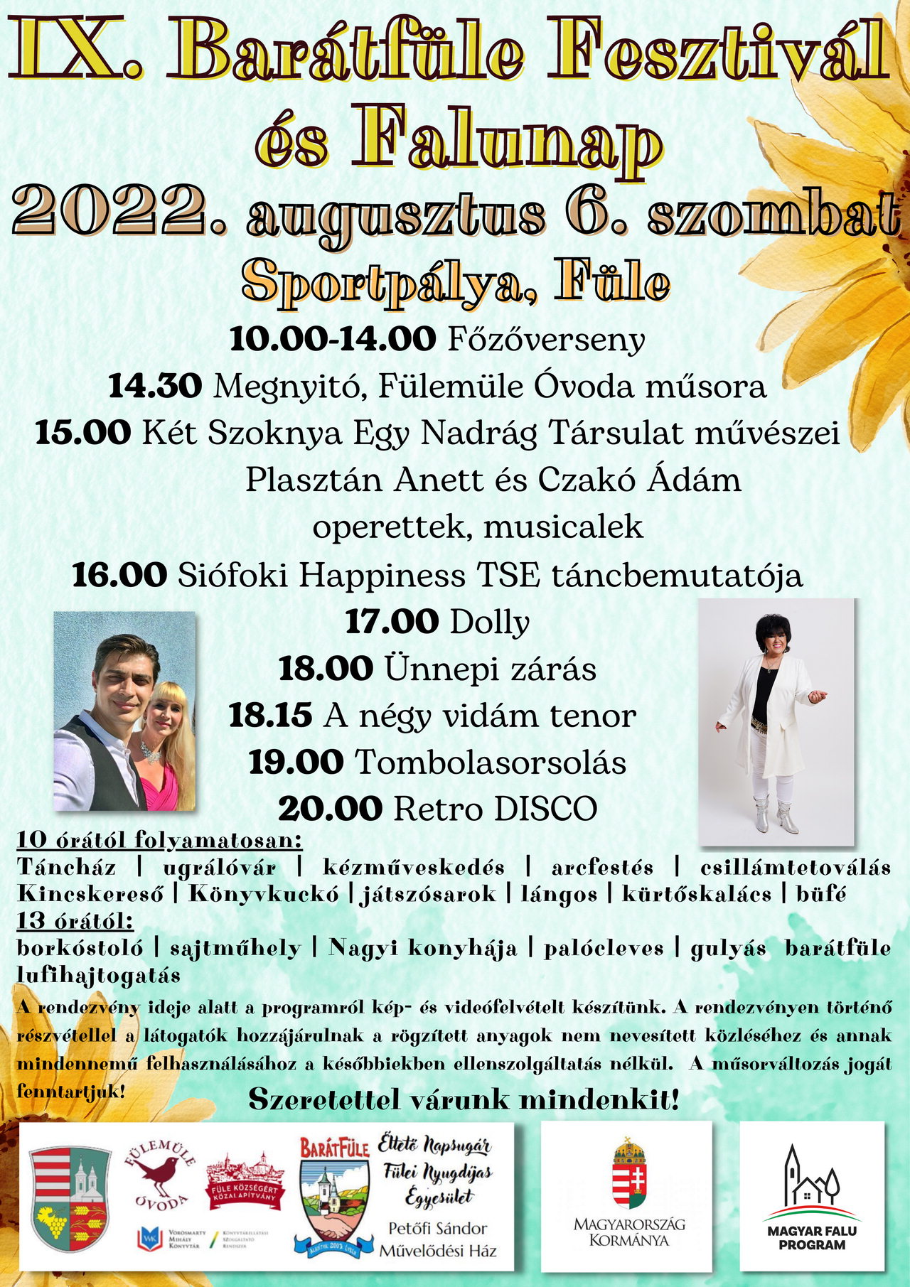 Örömmel közöljük, hogy a Magyar Falu Program támogatásának köszönhetően új partnerekkel közösen 2022. augusztus 6-án megszervezzük a IX. Barátfüle Fesztivál és Falunapot. Együttműködő partnereink: